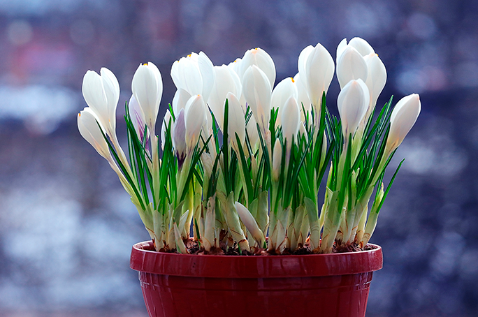 Notes: Move crocuses to a light spot with temperatures not exceeding 59°F (15°C). Otherwise, while they might bloom quickly, they’ll wilt quickly, too.