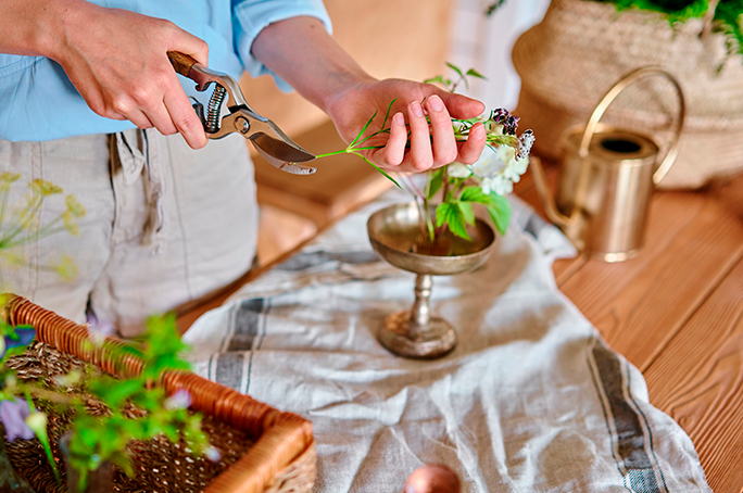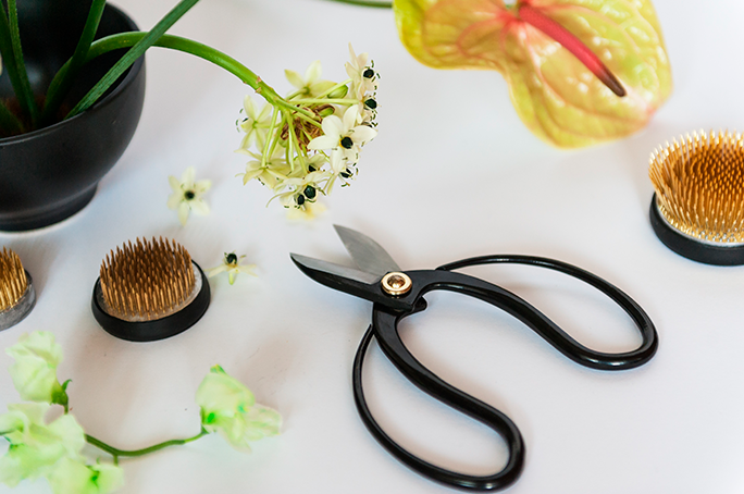 In ikebana, the materials you use matter just as much as how you arrange them. Start with seasonal local flowers and foliage. You’ll be working with three symbolic elements that represent