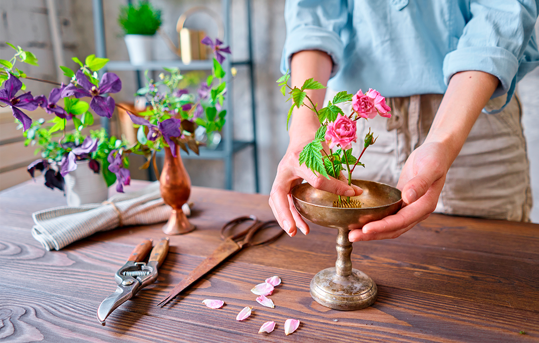 In ikebana, the materials you use matter just as much as how you arrange them. Start with seasonal local flowers and foliage. You’ll be working with three symbolic elements that represent