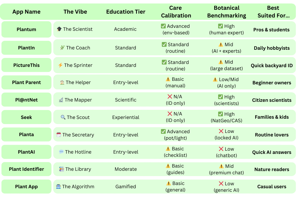 And the verdict? It was close! Plantum led the pack with 96% accuracy, followed by Seek at 95.05%, Planta at 95%, PictureThis at 94.90%, and PlantIn at 93.80%. However, none of the apps achieved 100% accuracy, showing that while these tools have improved, they still can’t match the eye of a skilled botanist.